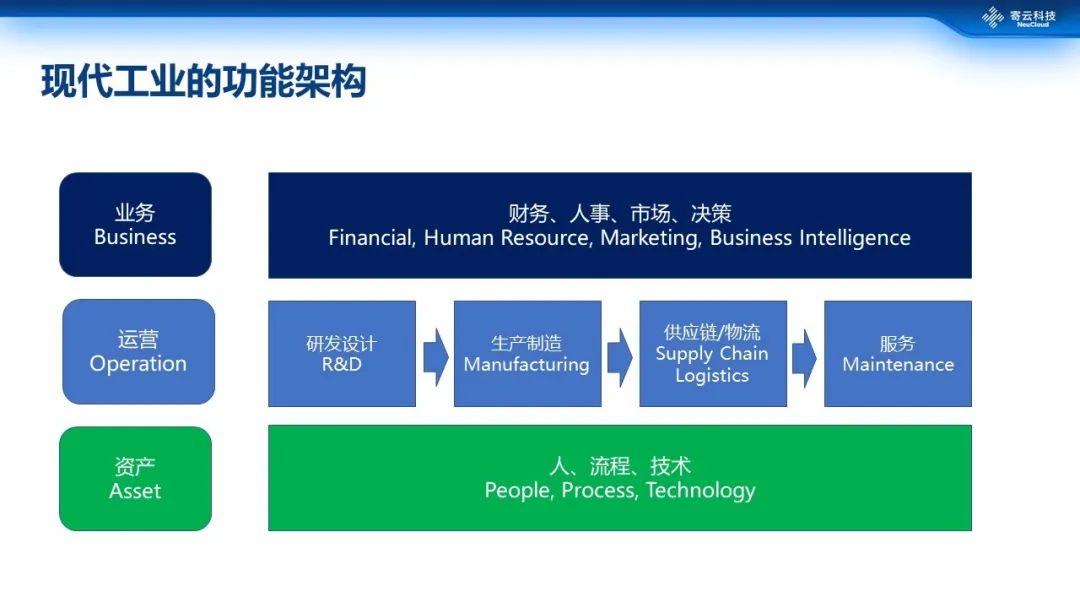 现代工业功能体系大致可以分成三个层面,从最下面的资产(包括人、流程、技术),到运营(从研发、设计到工程,再到生产制造再到物流、供应链,再到服务的整个价值链),再到业务(人事、财务、市场、决策)。
