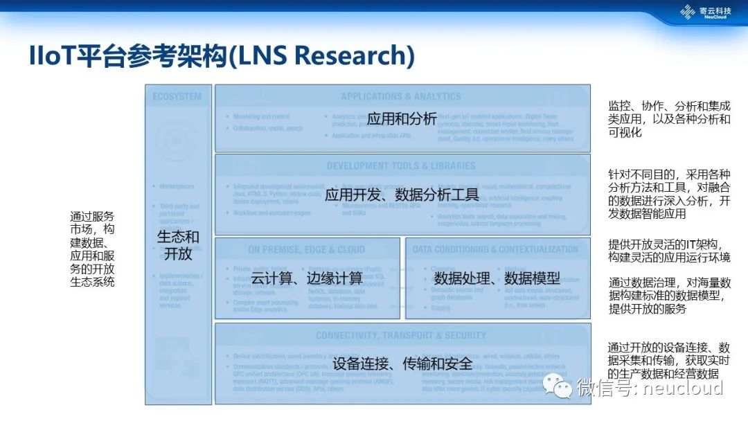 对于工业互联网平台,国内、国外都已经有了比较丰富的资料,也出现了多种版本的工业互联网平台架构,但总体来看大同小异,基本上都保持了从边缘端的接入、边缘计算,一直到工业数据的管理和分析,以及到工业数据的建模,再到工业应用的开发这个主题思路。上图是国外LNS给出的架构图。