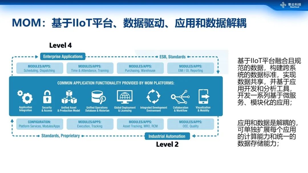 MES/MOM在工业互联网新形态下也要做大幅的调整,基于工业互联网平台构建一个数据驱动的平台,构建一系列生产、运营等模块化应用。对上连接第4层的业务系统对象,向下连接第2层的自动化系统。