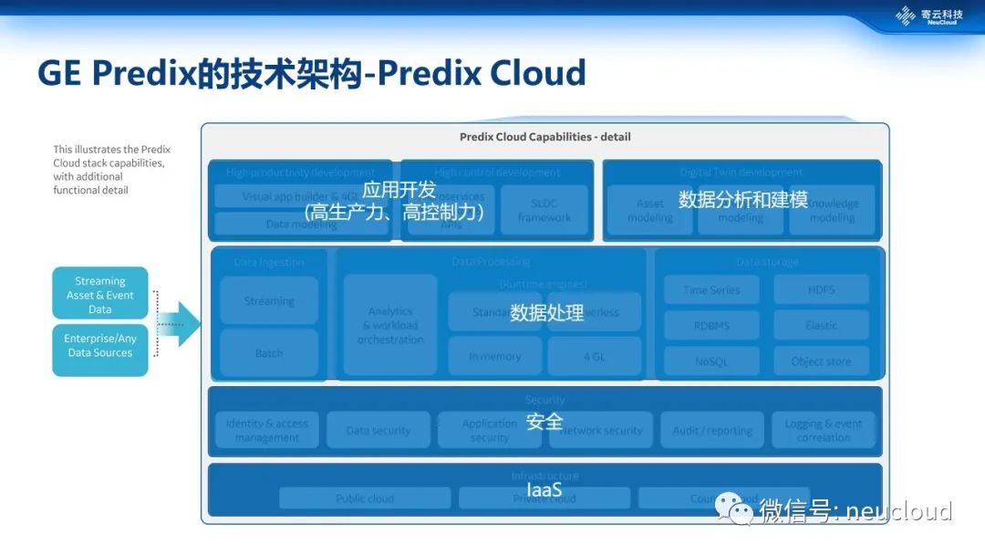 我们再来看Predix的云端,同样大家也可以看到它的数据集成、处理、存储等模块,以及数据分析和建模,另外在应用开发方面predix着重强调了产品能力、可控两个方向,而支撑这些目标的是微服务、可视化的开发工具,同时大家也能看到对数据建模也是predix应用开发的重点。