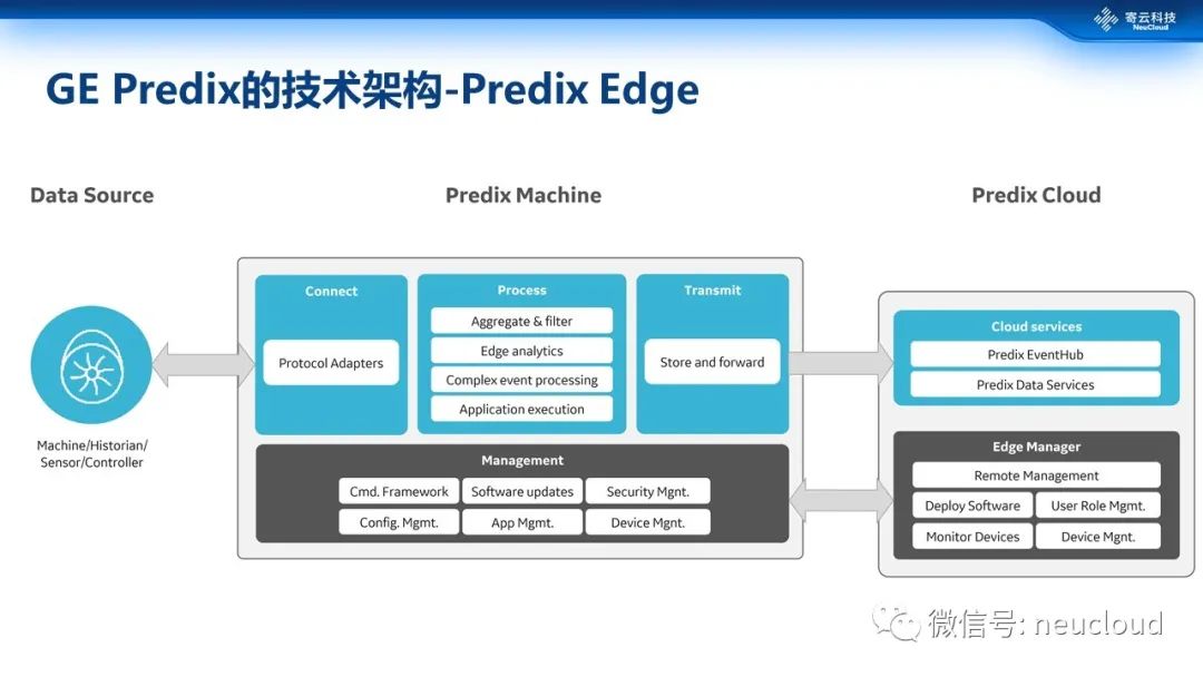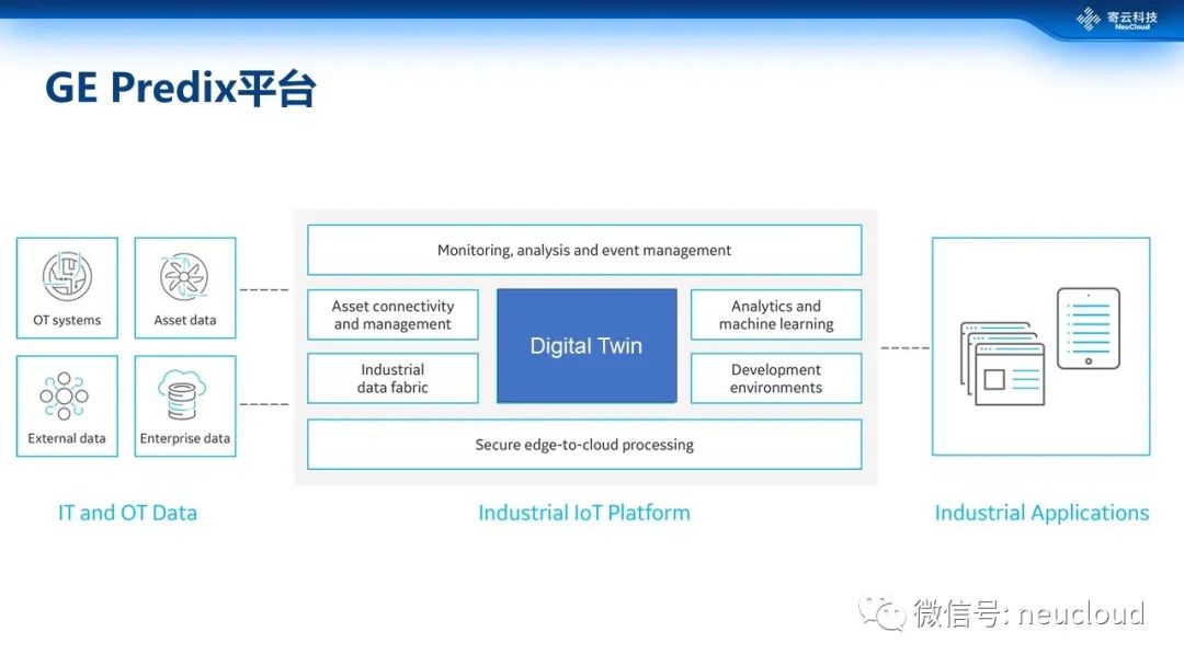 以上两种属于机构发布的通用架构,具体企业也会制定有不同侧重和理念的工业互联网平台以及各个环节的产品和服务。首先来看大家比较熟悉工业互联网先驱predix架构,相比来说其平台核心关注点可能更加的突出Digital Twin数字孪生的理念及其核心地位。