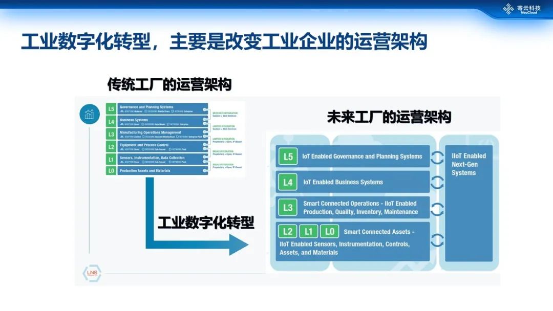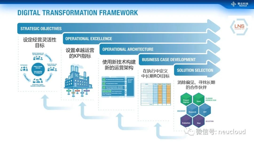 我们再看一下LNS给出的这个数字化转型框架。第1个阶段就是制定经营目标,该阶段关键在于“灵活性”,也就是充分考虑市场需求的变化,各种原材料的需求变化,以及自身能力的变化,制定具有一定灵活性的绩效指标。第2阶段要制定一个卓越运营的KPI指标。大家可以回头看看我们之前讲到的ISO22400之类的指标体系,重要的是要从繁杂的指标中分清主次,找到适合自己业务的指标组合体系。第3阶段使用新的工业互联网技术构建新的运营架构。第4阶段在每一个过程里面设定相应的中期、短期和长期的目标ROI。第5阶段消除偏见,寻找长期的合作伙伴,而不是临时的供应商。