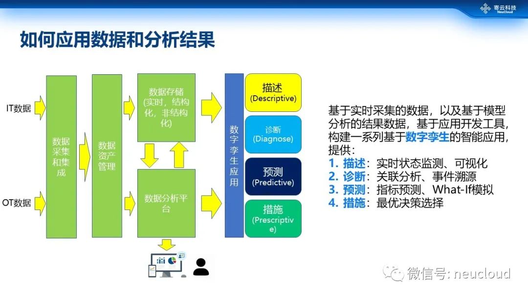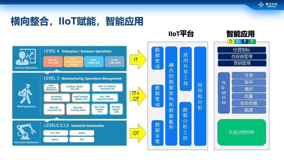 我们把传统的纵向集成变成横向数据集成,从IT系统里面抽取相应的指标的一些数据,从OT系统抽取一些实时的数据做相应的关联,在同一个IOT的平台上实现融合的数据的架构和数据的服务,再利用一系列的应用开发的工具、数据分析工具来实现相应的应用和分析。