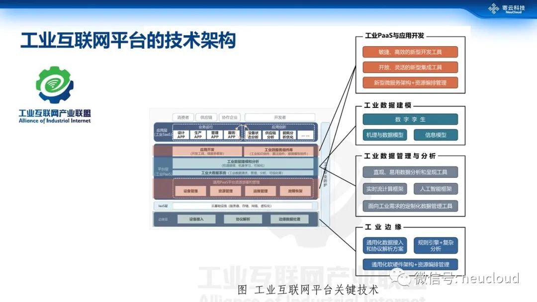 国内工业互联网产业联盟发布的架构也遵循从下往上的主题思路,尤其大家可以看到架构对从接入到管理、分析与建模等全流程的数据能力很重视,此外敏捷、高效的应用和模型开发等也是架构的重点。