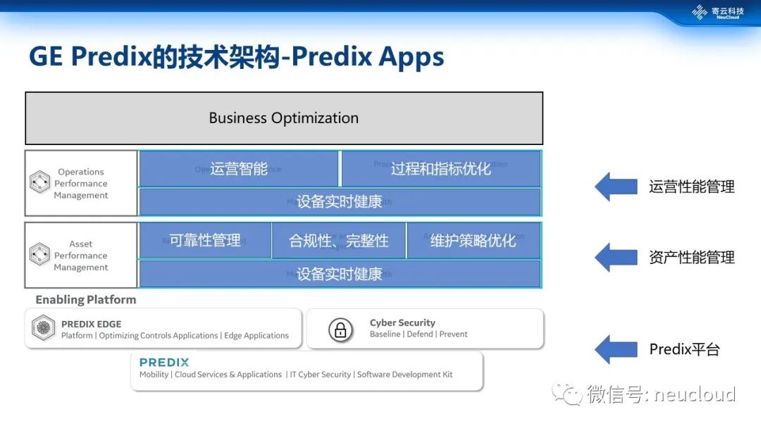 在应用这个层面,predix构建的应用大致可以分为这么两类,一类APM,就是资产性能管理,包括可靠性管理、设备实时健康监测、设备可靠性管理、合规性管理和维护策略优化,另一类是运营性能管理,包括运营智能、过程和指标优化等。