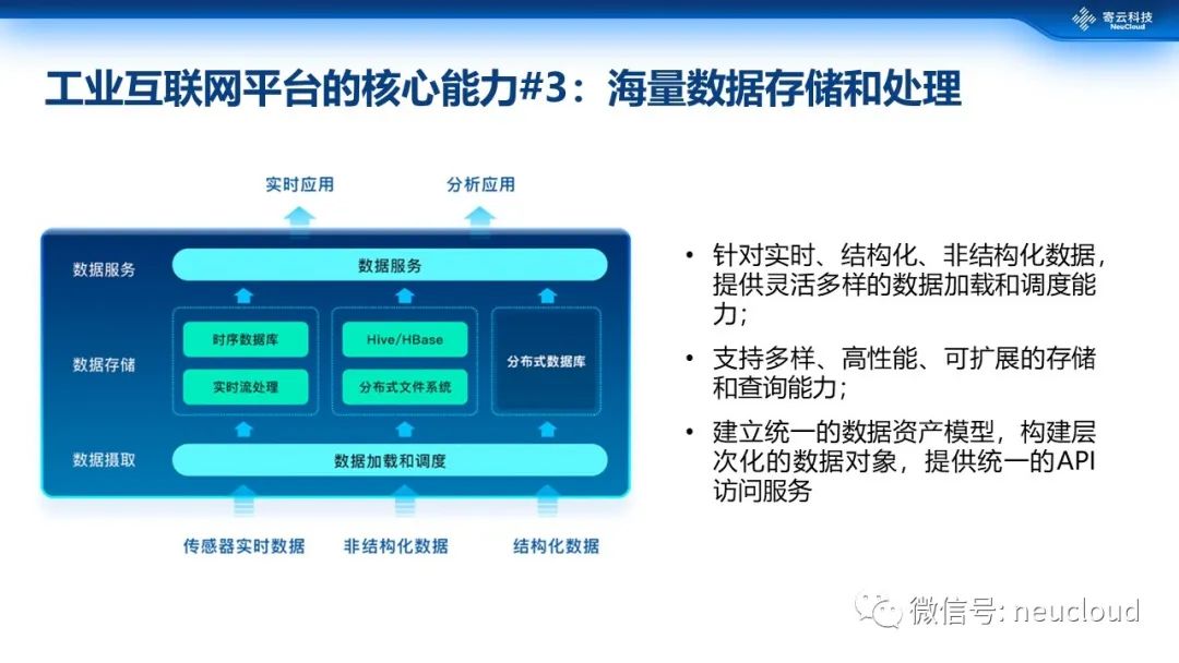 在云端,需要提供三类数据:实时数据、结构化、非结构化数据的存储、处理和开放能力。寄云NeuSeer 平台通过数据湖、元数据管理系统、寄云NeuSeer时序数据库等平台产品和组件,实现IT和OT异构数据的融合、数据的统一服务、海量工业数据的专业高性能存取、数据模型和数据资产服务,为上层的数据分析和数字孪生应用打好基础。
