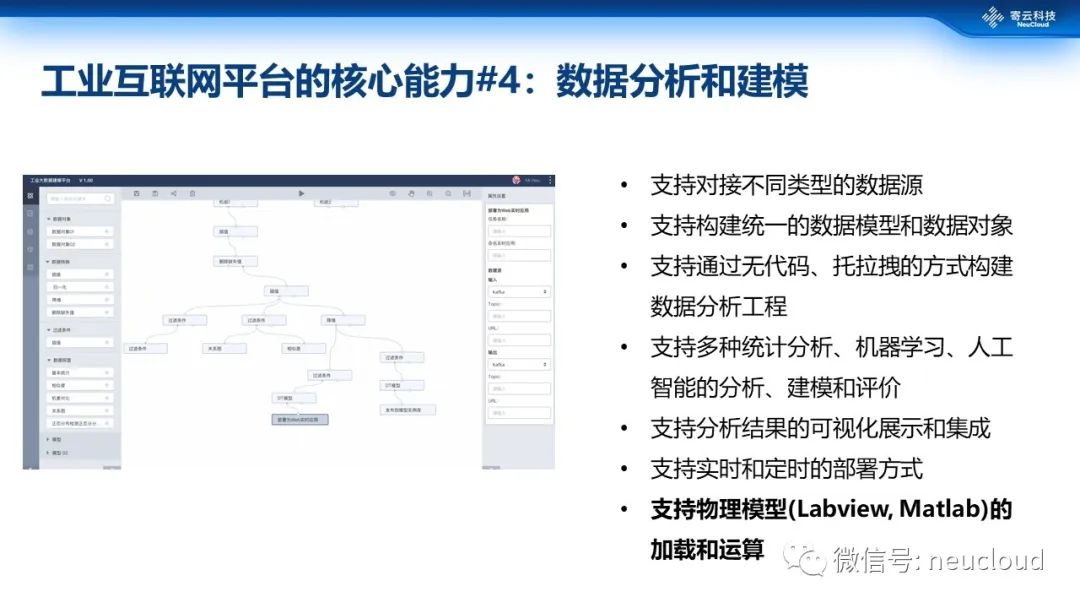 在数据统一、高效存取的基础上,基于大数据、工业互联网的数据分析才有可能顺利展开,因为传统数据分析浪费了大部分时间在数据准备阶段。同时,要想实现数据分析场景的广泛化,数据分析工具的简化、数据分析相关应用的开箱即用等特性是当今数据分析的重任。在这方面寄云NeuSeer DAStudio数据分析与建模平台已经实现了无代码、低代码分析,通过拖放式、可视化实现各种统计分析、机器学习、人工智能等分析建模和评价。