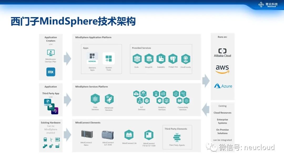 我们再来看西门子的MindSphere,通过其架构图我们已经可以看到该平台开始注重各个层面的横向沟通、集成。
