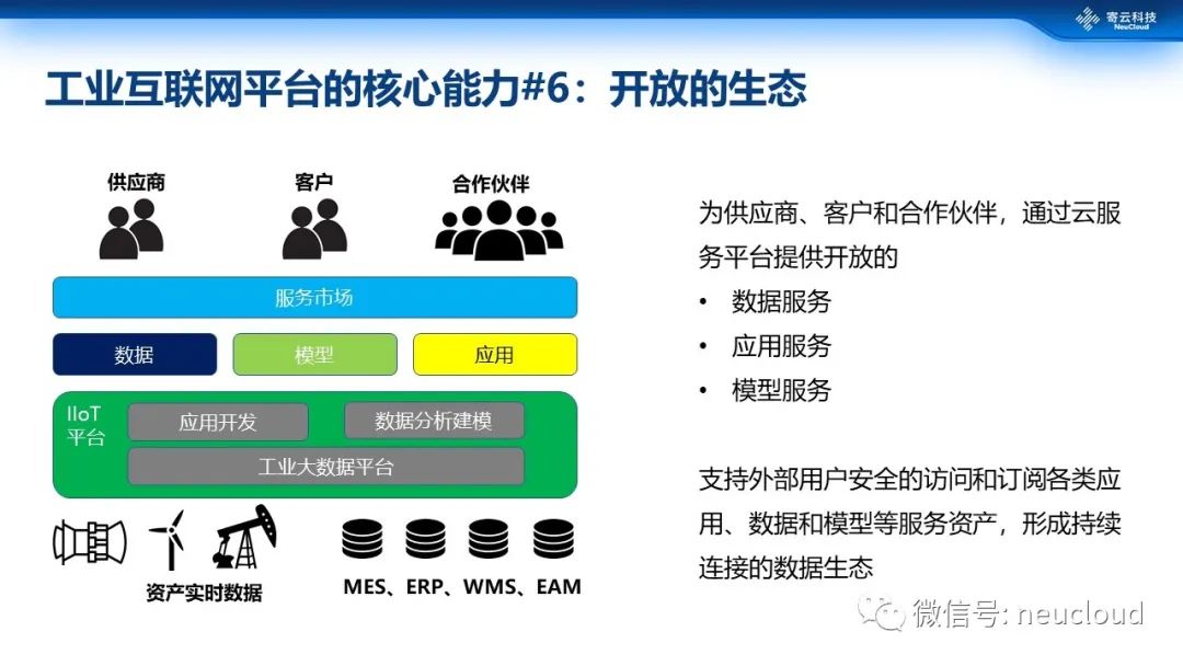 针对一些超大型工业企业,可以在平台基础上实现一部分能力开放,构建包括应用、数据、模型的能力开放平台,对接企业供应链、客户以及生态合作伙伴,构建持续连接的数字化生态。寄云云服务市场(BOSS系统)为这种生态平台提供用户运营、交易管理、平台对接、资源管理等服务,目前已经协同腾讯云落地多个地方工业互联网生态平台。