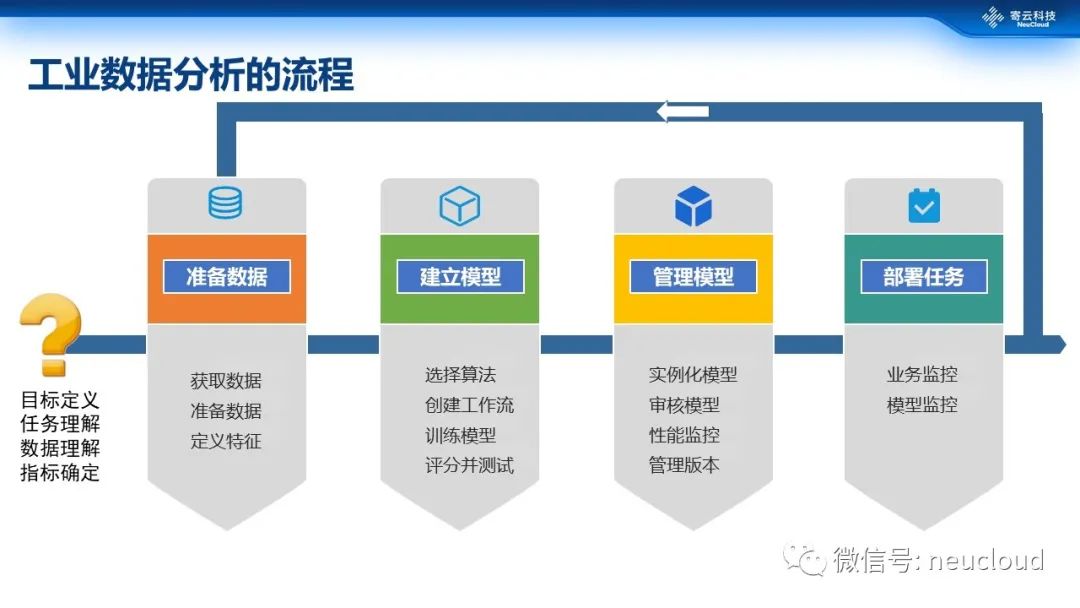 对于数据分析已经有多个机构将其过程、方法进性了定义,虽然不尽相同,但大致都会包含这几点:首先一定要有很清晰的目标,比方说良率提升,为了实现这个目标我们就需要对良率指标进性拆解,对数据做相应的准备,提取相应的特征。然后根据目标和数据之间的关系寻找分析方法,建立起分析模型,选择相应的算法,创建工作流,选取数据对模型进行训练,还要根据结果对模型进行评估。筛选出来的合适模型的应用,一般来说或者放在一个实时的生产环境里,应用于实时数据并获取结果;或者把分析结果放在数据库里支持相应的应用程序使用。