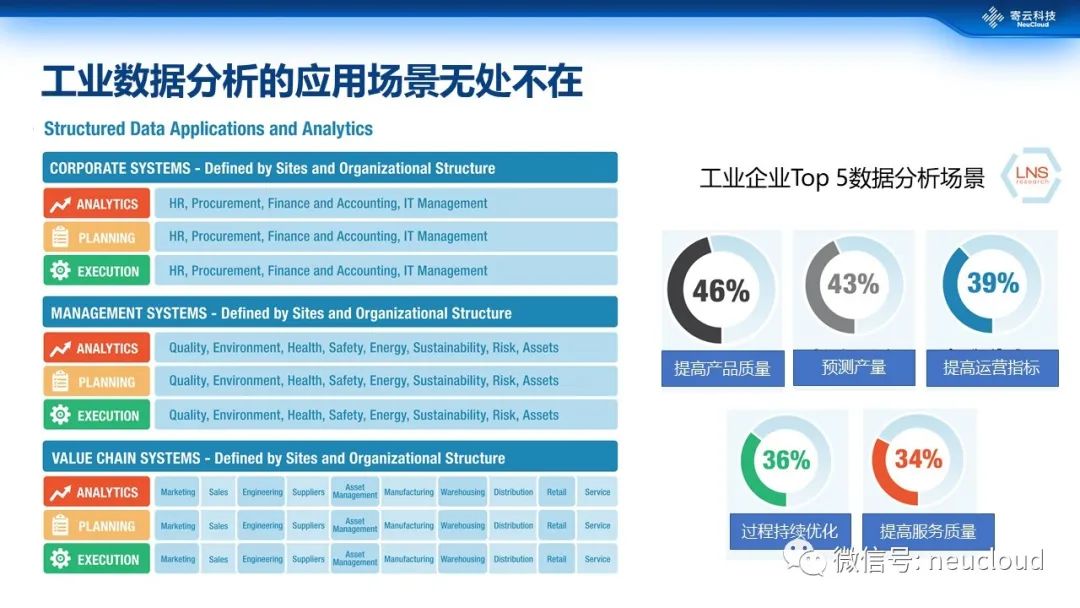 数据分析可以应用到企业的经营层面、决策层面、生产层面、设备运维层面等各种场景。据LNS报告显示,工业企业数据分析的主要场景有5类,分别是提高产品质量、预测生产产量、提高关键环节运营指标、实现过程的持续优化和提高产品的服务质量。