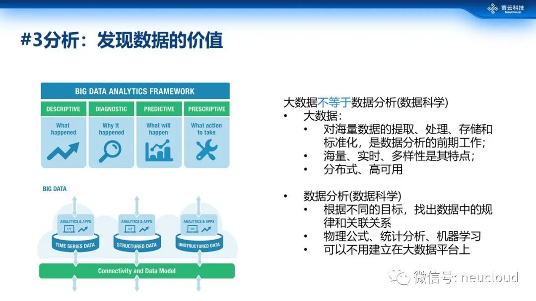 工业数据分析的价值非常高这一点行业已经没有异议,但大家对数据分析和大数据的认知还存在误解。首先数据分析不等同于大数据。大数据其实做的是一些基础层面的事情,提取、存储和标准化,特点就是海量、实时、多样性,它的适用场景很多是在于近实时、分布式、高可用场景。但是数据分析或者叫数据科学在大数据之前就已经存在了,工业数据分析就是根据不同的工业生产目标发现数据的一些规律或者关联关系,找到解决问题的方法。我们提到数据分析包含物理、统计、机器学习和人工智能等分析方法。