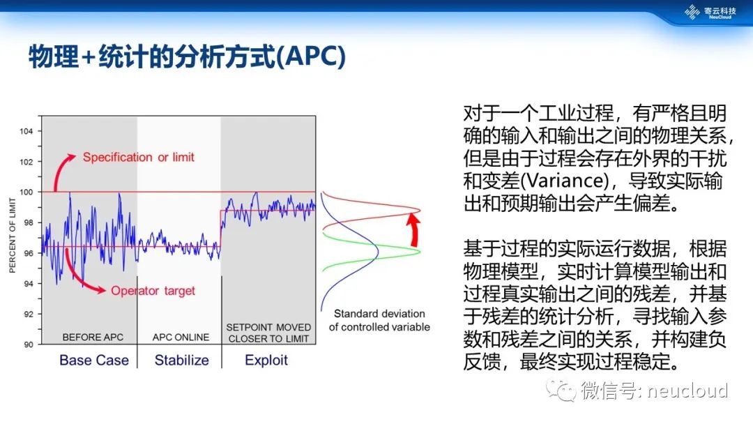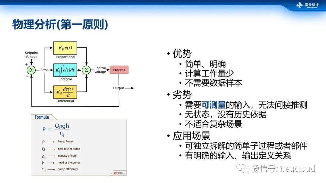物理分析方法就是传统的物理的、可解释的过程模型。比如,PID就是一个简单的线性或者积分、微分的过程,公式和结果都比较明确。物理分析的优势是简单,不需要太大的计算工作量,也不需要很多的数据样本就可以完成。但是它的劣势也非常明显,首先它取决于有没有一个明确的可以测量的输入输出,但在工业里面其实有非常多的场景数据,没有办法直接测量到很多工况,比如炉子中心温度。第二是没有状态,跟历史无关,它就没有历史的数据保存。第三不能适应复杂的场景,比如说一个高度集成化的化工厂,就很难用单一或者组合的物理模型描述出来。因此,物理模型,比较适合简单独立、有明确输入输出关系、可解释的的子过程的分析场景。