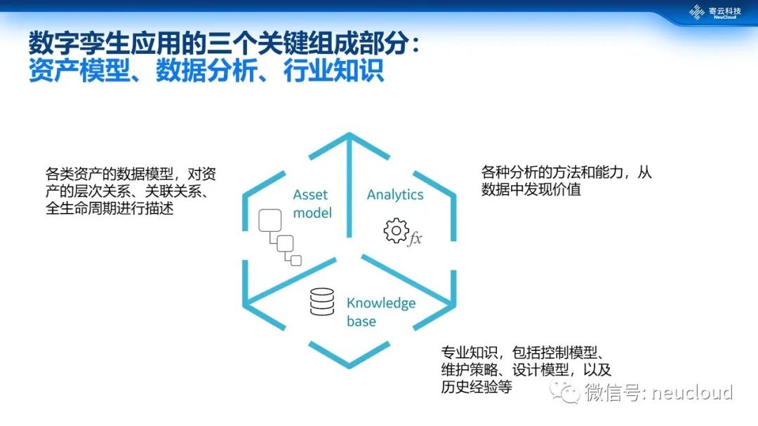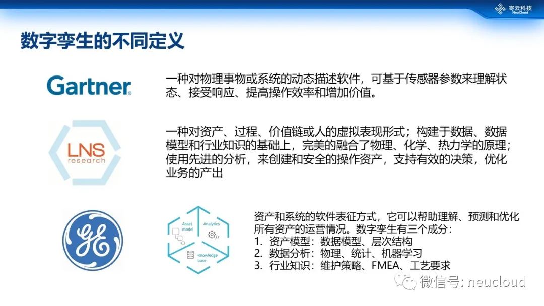 对数字孪生的定义其实有很多种,大家可以大致了解一下Gartner、LNS以及GE提出的观点。其中GE提出的资产模型、数据分析、行业知识三位一体的观点,比较形象直观,给实际的业务应用能够带来指导。