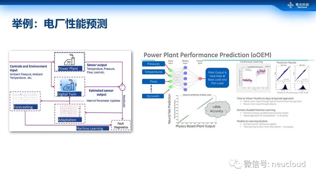 上图是GE提出的电厂性能的预测,把环境变量的一些参数输入到神经网络里,实现精确的性能预测,同时把输出的预测结果和改进的决策建议和控制参数结合,实现优化并反馈控制,提升电厂燃烧效率,一些结果已经能够验证。这个案例也可以看作是数字孪生的一个典型案例。