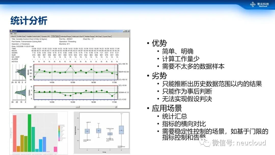 三种分析方法中统计分析占比最高,大家见到的各种各样的统计报表、SPC、各种各样的分布图,这都属于统计分析范畴。它的特点也是简单明确,计算工作量比较少,也不需要太多的数据样本。但它的劣势也比较明显,它只能推断出历史数据范围以内的一个结果,这种通过局部推断整体的情况毕竟有着很大的局限性。第二统计分析属于事后分析,就是问题出现以后的分析,无法实现假设性判定。