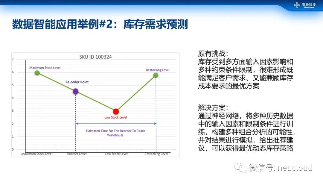 第二个例子是库存的预测。早期库存受到多方面输入因素影响和多种约束条件限制,比如市场需求、客户订单、供应链,以及生产中的残次品、非计划停机等等,造成无法精确预测产能以及对应的库存需求,也就很难形成既能满足客户需求、又能兼顾库存成本要求的最优方案。现在,已经有人在尝试通过神经网络可以将多种历史数据中的输入因素和限制条件进行训练,构建多种组合分析的可能性,并对结果进行模拟,给出推荐建议,可以获得最优动态库存策略。