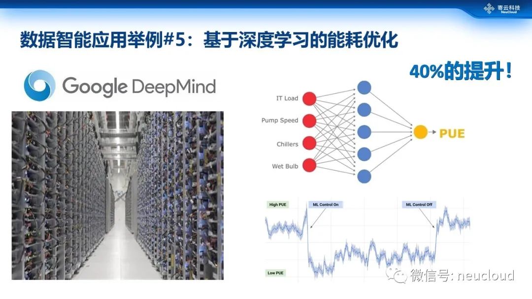 第5个例子是Google数据中心能耗的优化。如何降低数据中心能耗是一个世界性的难题,它涉及到的环节非常多,需要改进的参数也非常多(可能成千上万个),同时动态负载变化又非常快。除了物理改进措施,Google也在利用神经网络去解决数据中心的耗能问题。大量的参数被输入到神经网络中,通过增强学习寻找最优的优化组合,据说实现了40%的提升。