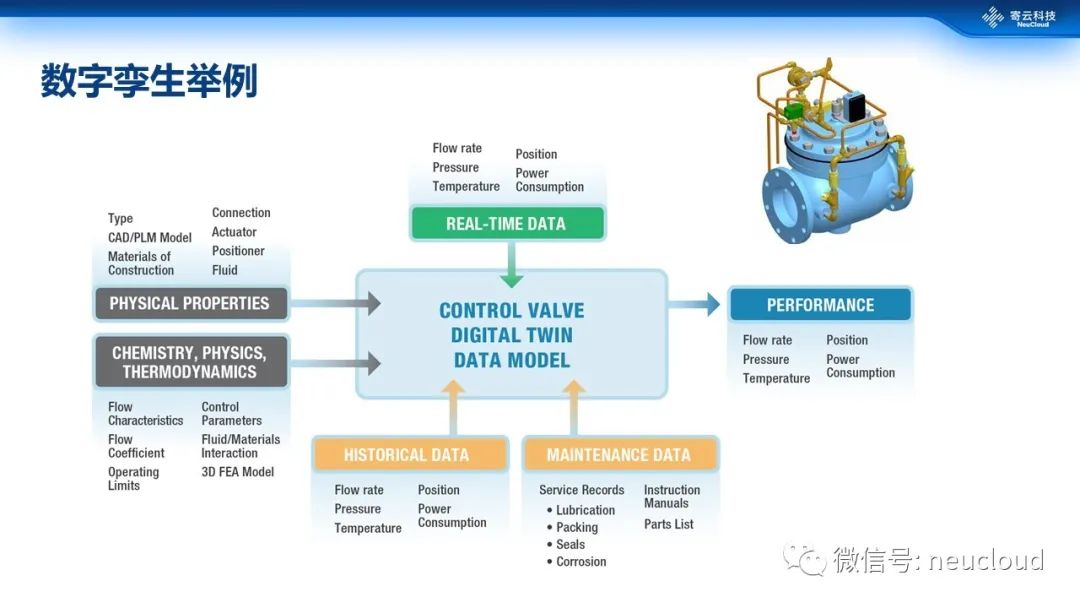 我们举个数字化阀门的例子,它涵盖了工程模型、数字模型,以及各种实时数据、历史数据,包括维护数据、各种指标(流速、压力、温度),还有相应的物理规则,这时候它已经是一个具备一定智能层次的数字孪生实例了,不再是简单展示。