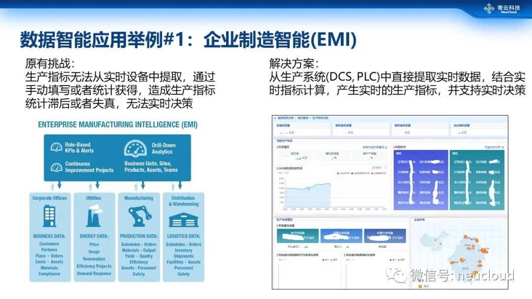 我们再举几个数据智能应用的例子,第一个是企业制造智能(EMI)。EMI其实是一个标准的制造行业术语,但在国内知道的人可能并不是特别多。传统企业尤其是离散制造类,或多或少的都会存在生产指标没有实现实时获取的情形,这样的过程、子过程数据一般通过手工填报统计获得,造成生产指标统计滞后或者失真,也无法支持实时决策。与之相反的是,数字化程度高尤其流程类制造企业,已经实现了从生产系统(DCS, PLC)中直接提取实时数据,并结合实时指标计算,产生实时的生产指标,并支持实时决策,这种其实都可以归为EMI的范畴。