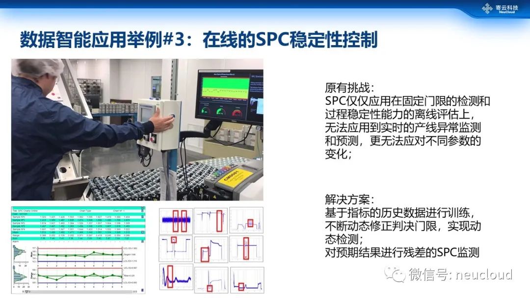 第三个例子是SPC,就是统计过程控制。SPC其实并不是一个新概念,但是一直以来它仅仅被应用在固定门限的检测和过程稳定性能力的离线评估上,无法应用到实时的产线异常监测和预测,更无法应对不同参数的变化。比如说质量控制,人们可以用SPC检测相关的过程能力指标,但是却无法把这些检测到的指标直接反馈到产线的实时运转过程中去。现在,人们开始把数据的检测、指标的计算等提升到实时的水平,同时,基于指标的历史数据进行训练,不断动态修正判决门限,实现动态检测;对预期结果进行残差的SPC监测。