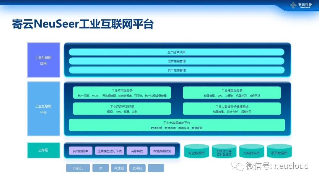 当然,寄云NeuSeer工业互联网平台也遵循通用的工业互联网平台框架,但同时寄云NeuSeer平台作为一个工业互联网平台的实例产品,也有很明显的自身特性和侧重点,从我们的架构图也能一窥一二。比如,它在平台层面提供工业应用微服务、工业模型服务、工业数据分析建模系统等,而在应用层面,寄云科技主要专注在设备的资产管理、运营效率的管理和生产经营决策这几类的应用场景。