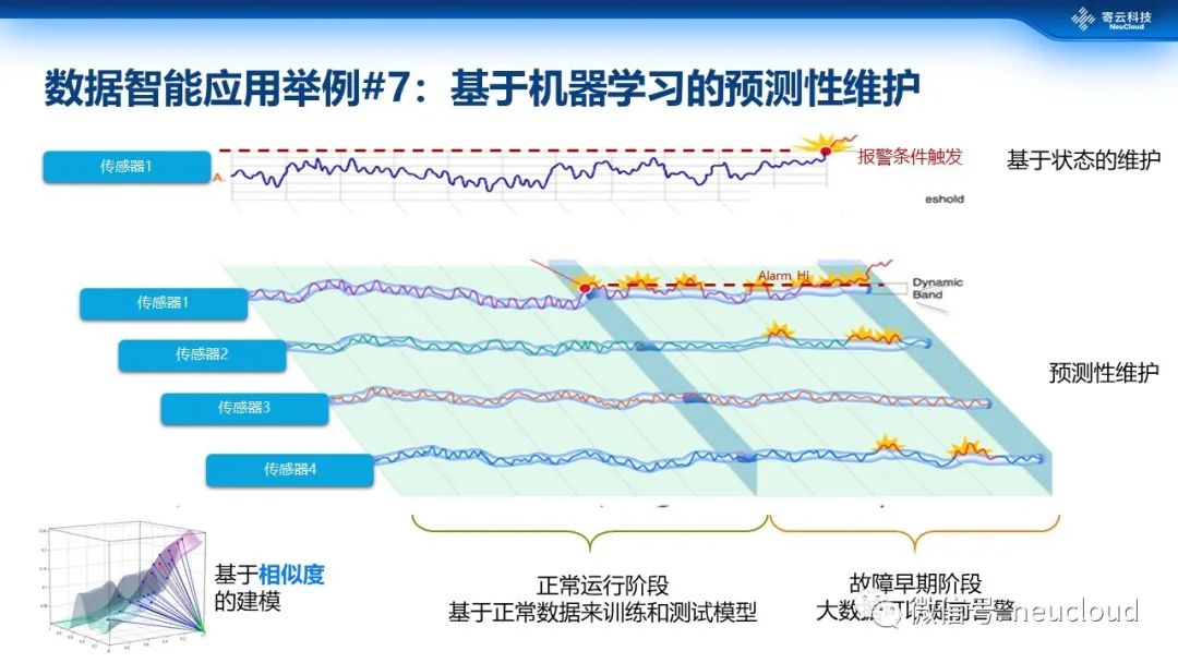 第7个例子是基于机器学习的预测性维护。传统设备维护一般基于固定的告警规则、维护策略,成本高、能效低,尤其对设备故障造成的非计划停机缺乏低成本、有效的对策。预测性维护通过海量实时和历史数据,监测、学习设备的运转模式,发现设备故障早期的特征,以及设备故障的发展趋势,并能够将这种经验、知识广泛的应用到同类设备的监测上,在故障发生之前及早提醒工作人员采取应对措施,以免发生严重故障,造成非计划停机。