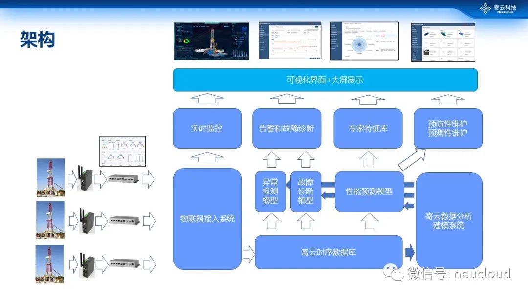 上图是整个解决方案的架构图,遵循工业互联网平台的主题思路。在解决方案中,每台钻机大概有1000多个传感器以及各种自动化系统的数据,比如电流、电压、扭距、转速等,通过寄云工业物联网网关、边缘计算网关以及时序数据库等进行采集、处理、分析和存储。尤其寄云边缘计算网关一方面可以实现实时的钻机状态监测和维护,另一方面可以和云端深度分析相结合,对钻机的智能维护具有代表性意义。在此基础上,结合寄云NeuSeer DAStudio数据分析与建模平台开发故障异常检测、故障诊断、故障预测等模型,以及相应的可视化的、可在线交互的应用。