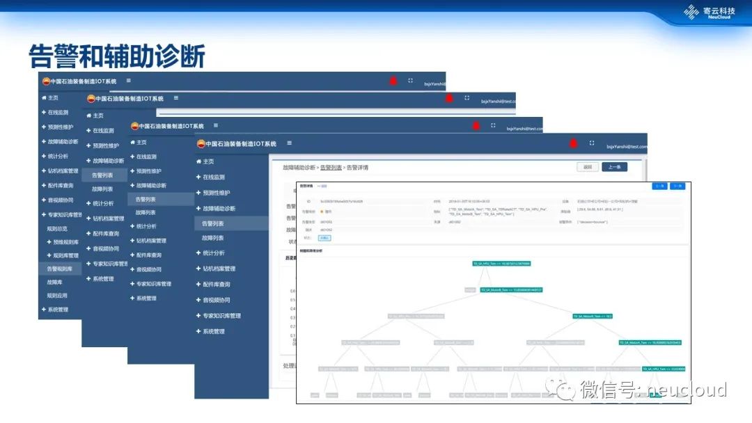 上面是方案的一些效果图,展示了基于实时数据的告警和故障诊断。以及包括电机、减速箱等设备的个性化告警规则设定,并基于告警规则形成故障诊断。