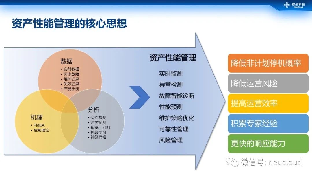 资产性能管理首先提取各种设备数据,再结合维护记录、故障库、产品手册等信息,同时在FMEA、控制理论等机理基础之上,通过变点检测、机器学习等分析手段,打造设备的实时监测、诊断、可靠性管理、性能预测、维护策略优化等应用,最终实现降低非计划停机概率、提高运营效率等目标。
