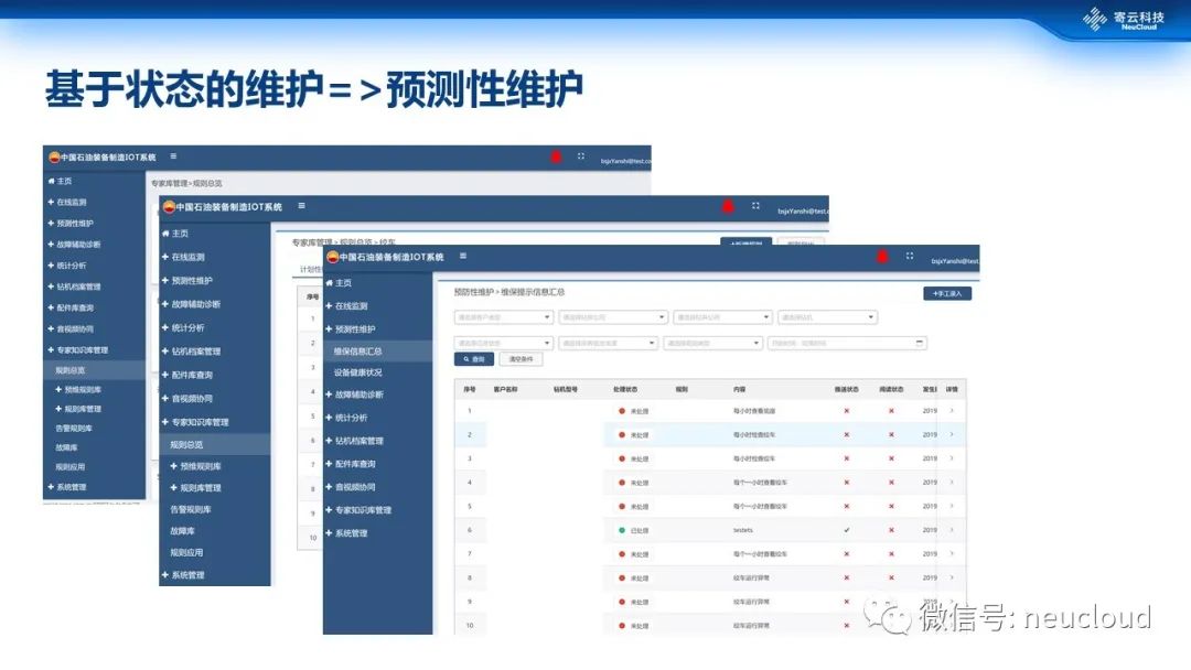 寄云科技协助中石油旗下宝石机械开发装备预测性维护和故障诊断应用,实现边缘层数据采集、数据平台层汇集,以及设备运行监控、健康度评估,以及基于实时数据的维修维护管理。