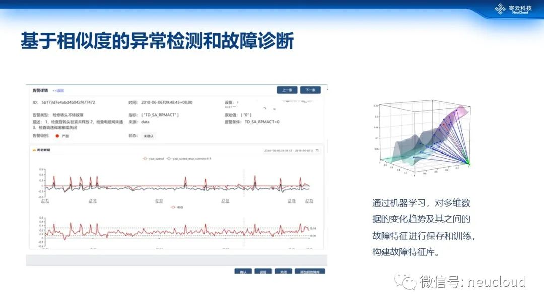 我们在此基础上也在尝试一些深度数据分析的拓展。比如,通过机器学习,对多维数据的变化趋势及其之间的故障特征进行保存和训练,构建故障特征库。