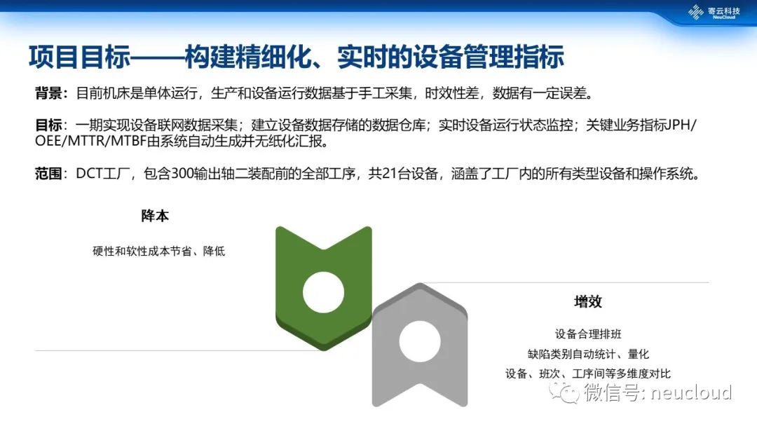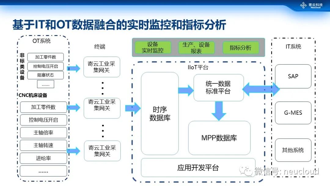 通过项目架构图可以明显的看到,这是一个典型的基于IT和OT数据融合的实时监控和指标分析的案例。首先数据既包含OT类非标设备以及机床设备参数,这一类主要是时序数据,也融入了包括SAP等IT系统排班等指标,这一类主要是结构化关系型数据,二者通过寄云NeuSeer平台提供的时序数据库、MPP数据库等实现数据的统一,最后基于寄云NeuSeer平台开发相应的设备监控和报表指标分析应用。
