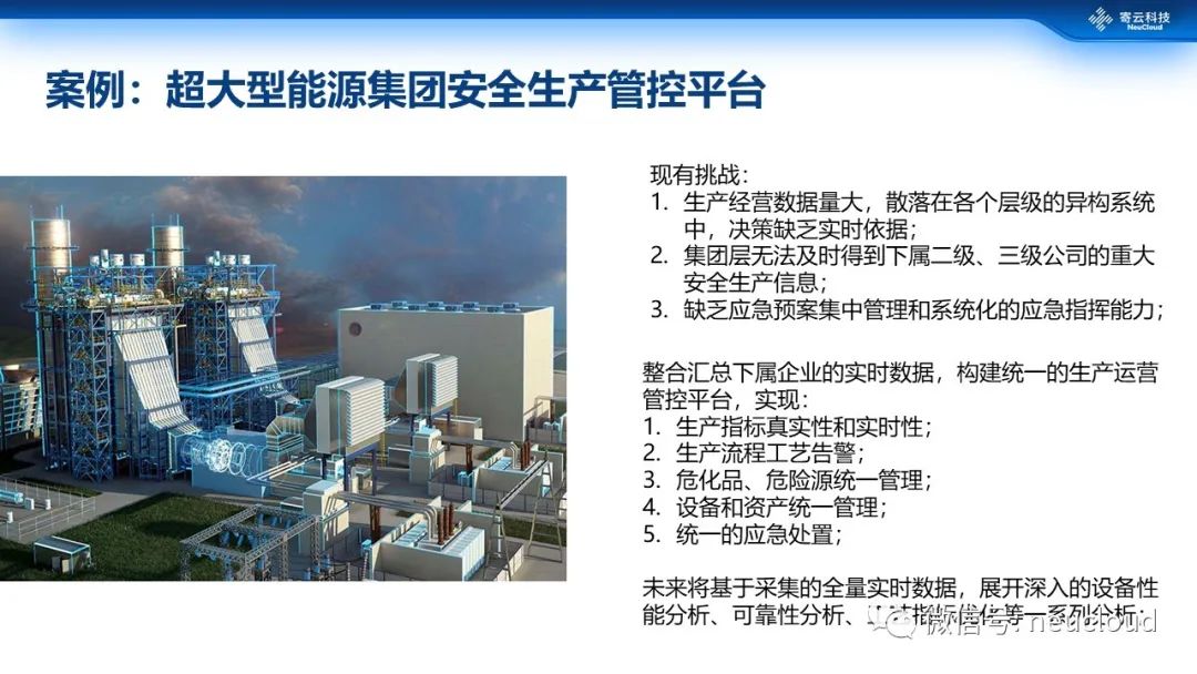 寄云科技服务的某超大型能源集团,有较多的并购、整合历史,一方面各子公司系统差异大,另一方面该领域业务系统极其复杂,使得集团层面一直以来很难实现数字化的业务和数据整合,造成集团层面无法及时得到下属公司的重大安全生产信息,也缺乏应急预案集中管理和系统化的应急指挥能力。借助工业互联网平台整合汇总下属企业的实时数据,构建统一的生产运营管控平台,形成一个统一的集团级决策和应急指挥的能力,是这类企业现阶段的刚需。