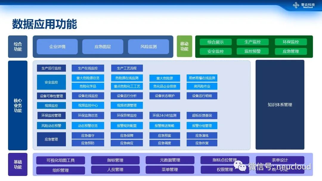 上图是项目开发的部分数据智能应用功能,包括生产运行监控、安全监控、视频监控、环保、应急指挥、可靠性、能耗一系列的管理,都统一在一个平台之上,同时它还会提供一个相对比较完整的企业决策支持。