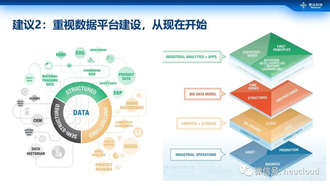 第2个建议是重视数据平台的建设。传统工业数据一般都会分散在各种独立系统中,数据平台通过数据融合能力,海量、高效、专业的数据存取能力,统一服务于智能数据应用,实现基于物理、基于统计、基于机器学习的数据分析。