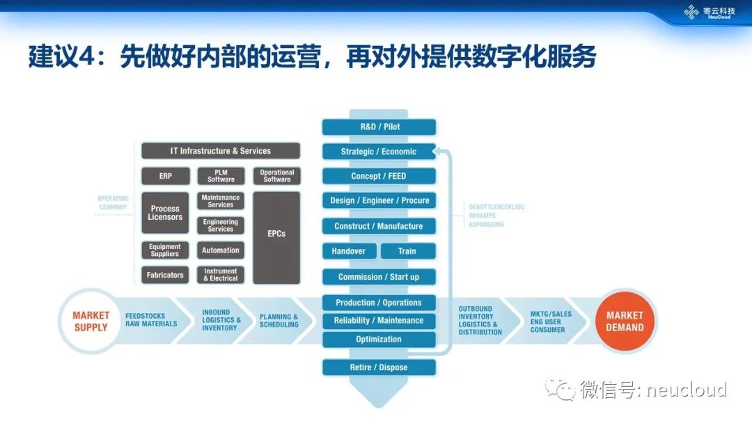 第4个建议是,大型企业自身数字化转型已经取得足够的成果时,再考虑对外提供服务。现在也有一些大型企业刚启动数字化转型没有多久,就已经考虑对外提供服务。我的建议还是先做好自身的基本功,把质量、效率、产能,这些指标先用数字化的方式来改进起来。从两个维度展开,第一个是价值链的维度,从供应链再到工厂,再到客户,再到渠道,逐步的拓展开来。第二个产品生命周期,从研发设计,再到生产制造,再到产品服务,整个流程利用数字化手段管理起来。