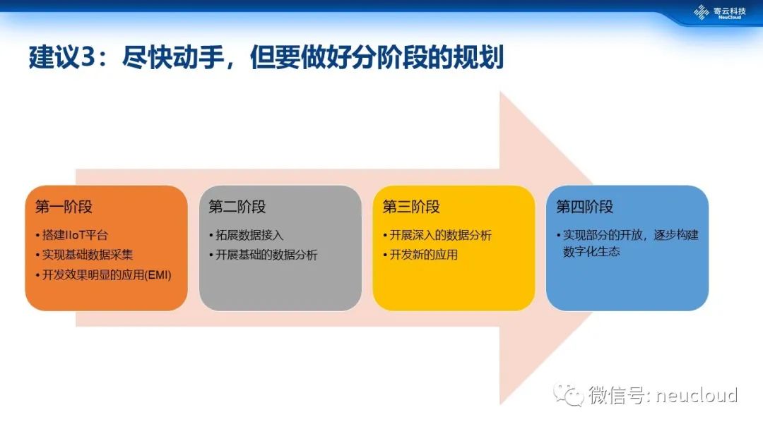 第3个建议尽快拥抱数字化转型,做好分阶段的规划。第一阶段还是要做好一个平台的规划,做好相应的基础数据采集。同时,我建议本阶段可以从一些相对比较容易让决策层通过的应用开始。第二阶段,不断的拓展更多的业务系统、自动化系统的接入。同时,展开一些具体的基础分析,比方说良率的分析、产能的分析来实现快速获得回报,本阶段不建议进入“大而全”的尝试。第三阶段深化相应的数据分析,开发一系列的数据智能应用。第四个阶段有条件的超大型的企业可以考虑数字化生态的一个构建,基于已有的服务能力,去开放相应的模型、相应的数据、相应的应用,打造数字化的生态。
