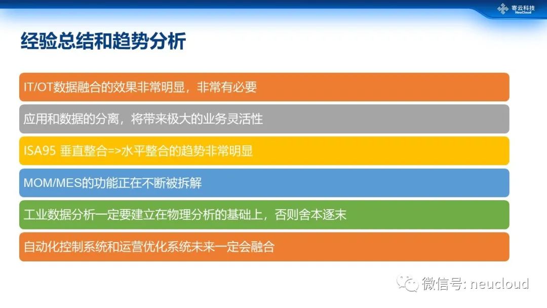 从这一系列的项目中,我们也看到了一些趋势,在此也分享给各位。首先,IT和OT的数据融合势在必行,非常有必要,而且效果惊人。每一个关键过程的指标,一定是跨OT和IT系统的基础上,通过融合的数据和实时的计算得到的。这种融合,可以让关键的指标更精确,更实时。第二,应用和数据如果实现分离和解耦,将会极大的提高业务的响应能力,带来业务的灵活性的提高,因此,就需要一个标准化的数据平台,以及快捷的应用开发工具。第三,ISA95已经从传统的纵向、摘要数据的整合,逐步走向横向、全量数据的整合,并且实现跨L0-L4五个层级的数据标准。第四,MOM/MES的功能,已经开始瓦解,逐步变成一个统一的生产运营平台上的、基于相同数据标准开发出来的、轻量级的、基于微服务的一系列新的应用。第五,工业数据分析不要尝试走捷径,一定是基于对物理过程、设备的了解的基础上,结合一定的统计分析和机器学习,才能起到准确而令人信服的结果,否则是舍本逐末。第六,另一个可以看得见的趋势,是IT系统和OT的融合正在扩大到控制系统,APC已经是一个IT和OT融合的例子,随着硬件性能的提高、计算资源的丰富,未来这类融合将会越来越普及,下一代控制系统,一定是结合IT和OT的产物。