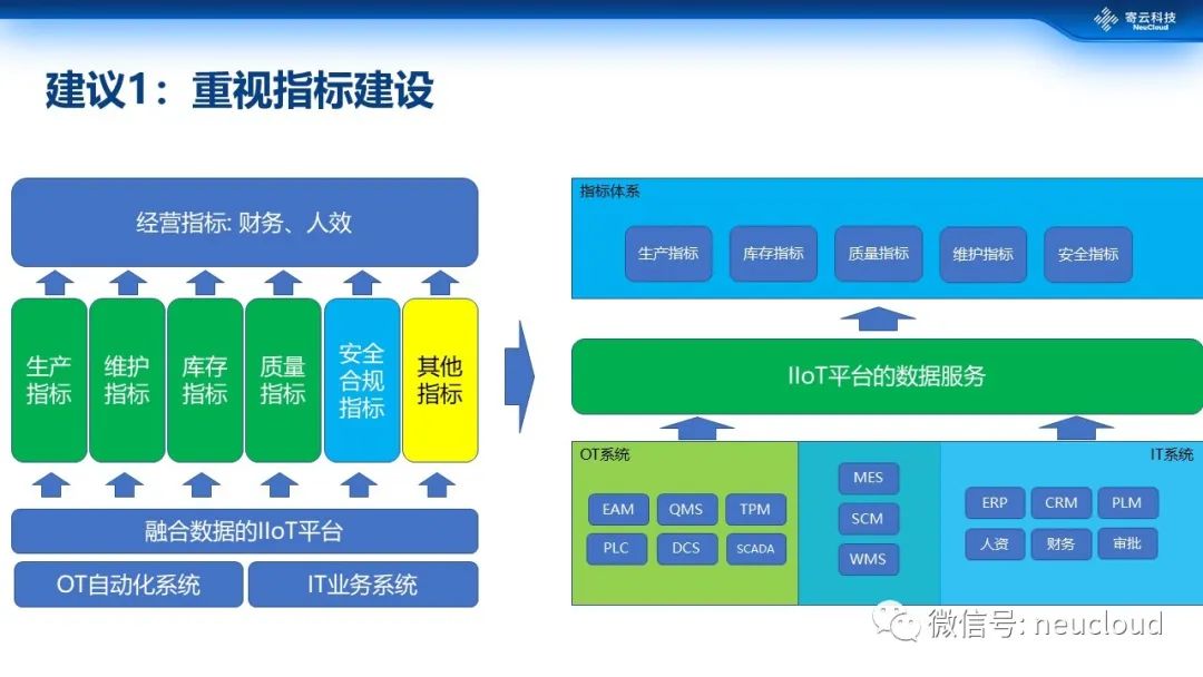 我们的第1个建议,重视指标的建设。经营、生产、设备、库存、质量、安全合规等指标,一方面实现数字化,另一方面要落地细化。数字化要借助工业互联网平台的融合能力,实现指标的统一管理和统一服务。