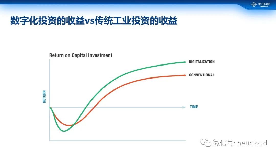 我们再对比一下数字化投资ROI和传统工业投资ROI。传统投资,包括比如自动化和机器换人。数字化投资,前期的成本肯定要比传统投资要搞。从时间和回报曲线来看,在开始获得回报之后,数字化投资的ROI提升速度要明显超过传统工业投资ROI,同时,从长远的收益来看,数字化投资的ROI也能够持续超过传统工业投资ROI,保持一个稳健的增长态势。