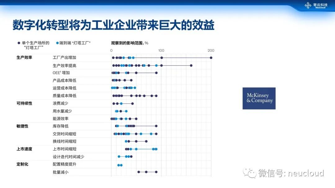 首先,无论是从国内外企业的实践案例来看,还是从像麦肯锡这样的调研机构数据来看,数字化转型确确实实能够带来很可观的一个能效,包括生产效率的提升、可持续性的提升、敏捷性的提升、产品上市速度的提升……甚至有些提升程度能达到200%的程度。