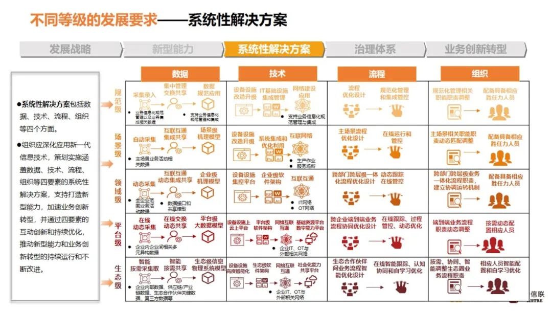 在解决方案层面,不同的级别要求差距也非常大,规范级更多的是数据收集,技术层面是做设备的基础数字化改造。流程层面就是按照规范化规则做流程设计,流程优化,组织调整。到了场景级就不是这样了,场景级和规范级最大区别是,在主场景范围内要求它能够实现数据全面自动采集,技术层面设备设施等都要打通,支持数采和实施数字化控制双向流程,主场景系统性设计,支持一定程度的模型驱动,流程驱动,场景相关组织也要根据流程做动态匹配。领域级就是全数字企业,一定是企业数字底层全通的,自动采集,自动处理,对上层应用支持迭代,如果数据层面支持不了,其他都是空谈,所以底层一定要有很强大的数据能力,而且是统一的。