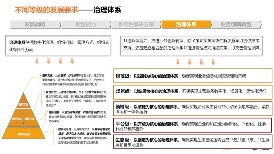 治理体系有几个核心关键词,如果你的管理治理仍然是以控制为核心,那你就在规范级。如果你的治理管理是以结果为核心,结果导向,那你就进入了场景级。真正的数字企业是以敏捷为核心构建起来整个运营体系和管理体系。平台级是以开放为核心,要没有这种理念和体系,就不会成为平台级企业。生态级是以创造为核心的体系。