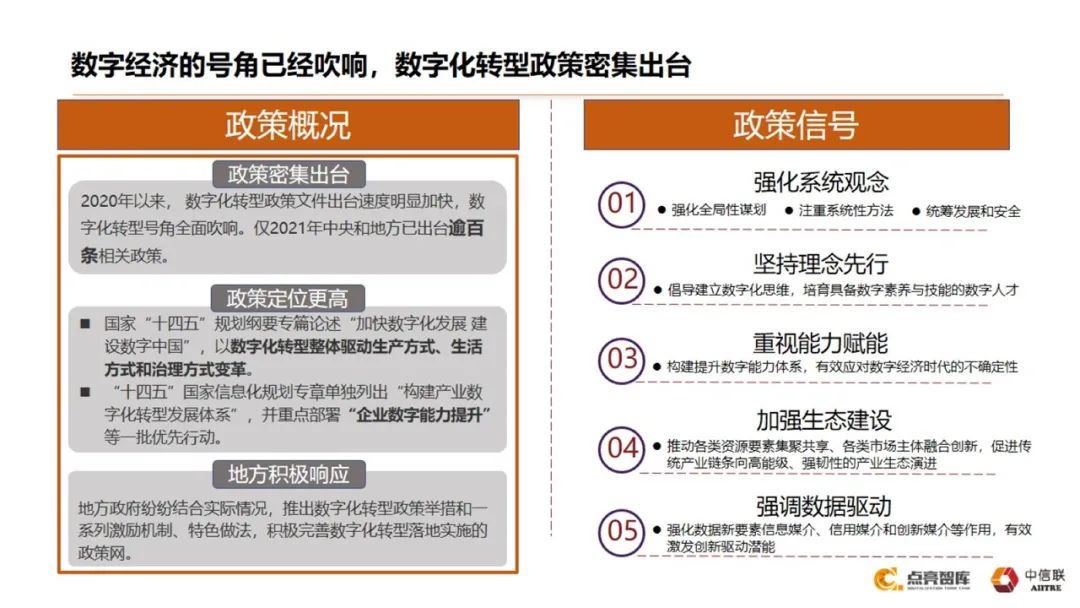 这绝对不只是企业自身发展的问题,也甚至不是一个地方经济本身的问题,而是全球性的问题,对于中国来说意义更加重大。在这种背景下可以看到这两年国家对数字化转型越来越重视,各种政策正在密集出台,而且有很多新的内容跟原来是非常不一样的,我们做了一个梳理,从中央到各个部委到地方,所有这些政策里面有五点信号是跟过去非常不一样的。