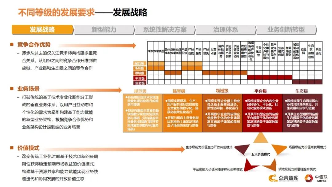 在价值模式方面,传统规范级就是一种传统模式的数字化升级。场景级就是基于某个点能力的重复使用(价值点复用模式),领域级就是价值链整合模式,平台级就是价值网络多样化创新模式,生态级是价值生态共创模式。