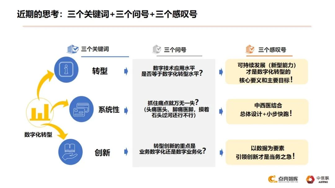 第二个关键词是系统性。转型是大系统工程,系统观念太难提升了。第二个问号是我们仍然只是痛点引领,头痛医头、脚痛医脚行不行?当然不行,我们一定要中西医结合,总体架构和迭代创新结合起来,也就是说总体设计+小步快跑才是我们今天应该选择的方案,这是第二个感叹号。