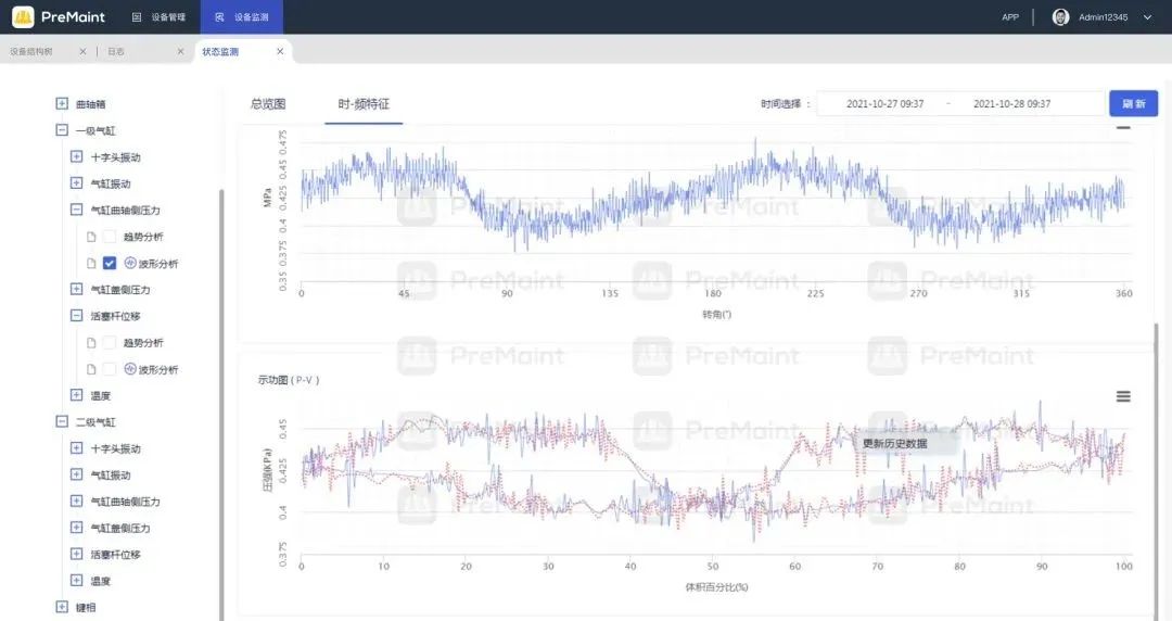 我们以PreMaint设备健康管理平台为例,PreMaint综合运用动态压力、振动和温度、油液分析等技术,基于内燃机的物理特性、物理规律,利用动力学规律建立机理模型,使用统计模型相关算法,结合时域数据、工艺数据、设备特征数据及各类报警预警数据等,构建内燃机故障诊断模型和故障分析可视化服务,有效、针对性的对内燃机设备进行实时状态监测与故障智能诊断。