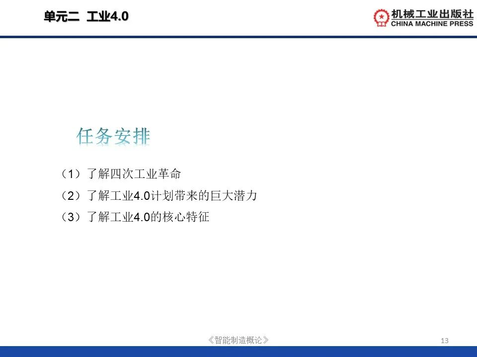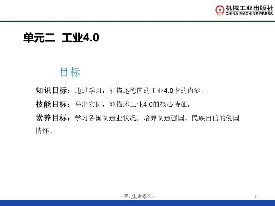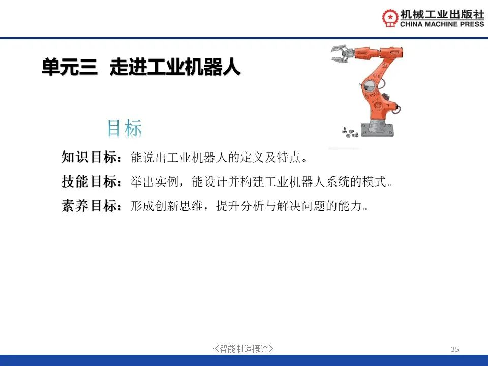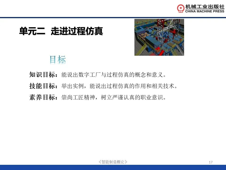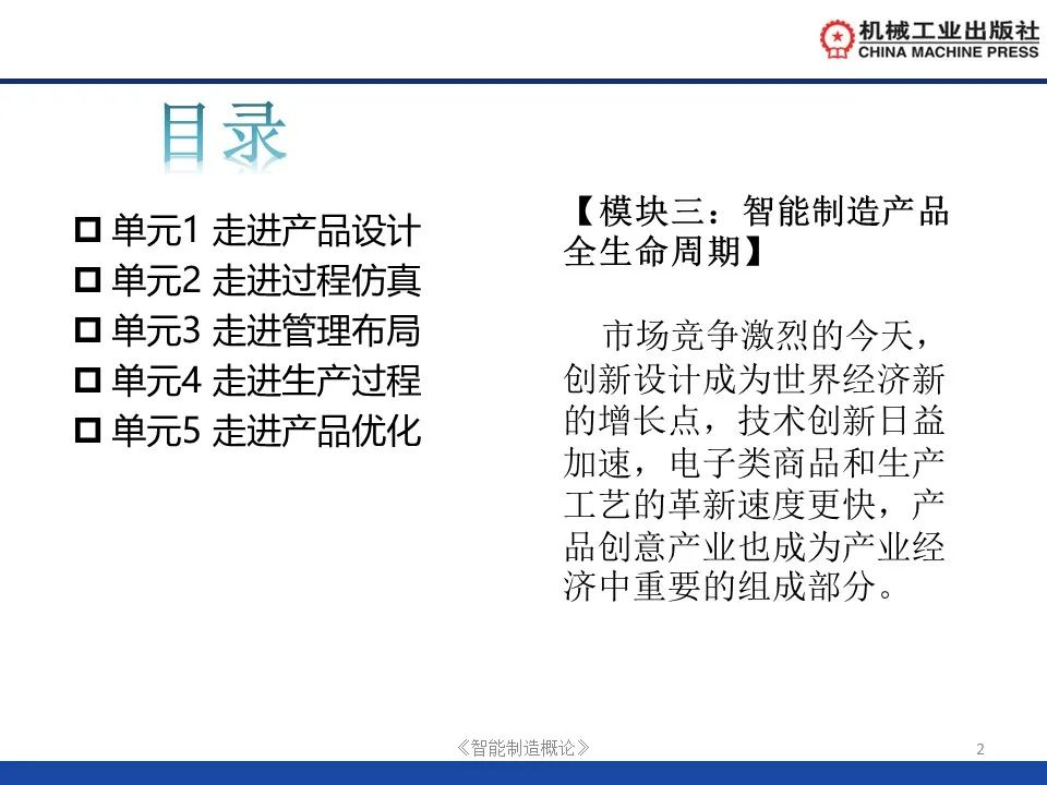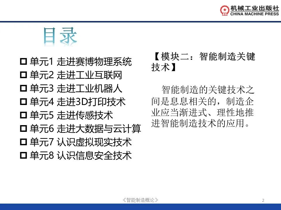 前言模块1走进智能制造单元1智能制造发展史单元2工业40单元3中国制造2025模块2智能制造关键技术单元1走进赛博物理系统(CPS)任务1认识赛博物理系统任务2构建赛博物理系统模型单元2走进工业互联网任务1认识工业互联网任务2构建工业互联网平台模型单元3走进工业机器人任务1认识工业机器人任务2构建工业机器人系统模型单元4走进3D打印技术任务1认识3D打印技术任务2构建3D打印模型单元5走进传感技术任务1认识传感技术任务2构建传感技术系统模型单元6走进大数据与云计算任务1认识大数据与云计算任务2构建大数据与云计算应用模型单元7走进虚拟现实技术任务1认识虚拟现实技术任务2构建虚拟现实系统单元8走进信息安全技术任务1认识信息安全任务2认识信息安全主要技术模块3智能制造产品全生命周期管理单元1走进产品设计任务1认识产品生命周期任务2设计及调整产品价值机会单元2走进过程仿真任务1认识数字工厂与过程控制任务2认识现代制造的架构及过程仿真单元3走进管理布局任务1认识管理任务2生产管理布局单元4走进生产过程任务1认识产品生产过程任务2了解生产过程环节的设计单元5走进产品优化任务1认识产品优化创新任务2创新实践模块4智慧工厂单元1走进智慧工厂的流程工业任务1认识智慧工厂的流程工业任务2流程工业系统分析方法与建模仿真单元2走进智慧工厂的混合工业任务1认识智慧工厂的混合工业任务2混合工业的组织与建模仿真单元3走进智慧工厂的离散工业任务1认识智慧工厂的离散工业任务2离散工业的结构及仿真单元4走进智慧工厂的数字化车间和产线任务1认识智慧工厂的数字化车间和产线任务2了解数字化车间系统功能结构与产线布置结构模块5智能制造运营管理单元1MES运用与管理任务1认识MES任务2MES的典型运用与管理单元2云平台运用与发展任务1认识云平台任务2云平台的实现形式与运用参考文献