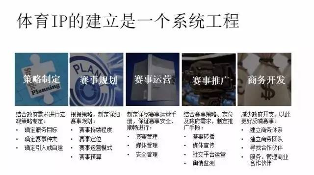那么优质体育IP是如何建立的呢?一般来说可以分为长期获取授权或者自创IP。当然二者各有利弊,无论是购买还是自创首先要搞清楚IP的核心内容,朱晓东将其总结为:策略制定、赛事规划、赛事运营、赛事推广、商务开发五个部分,每一部分又有非常细化的运营方式。